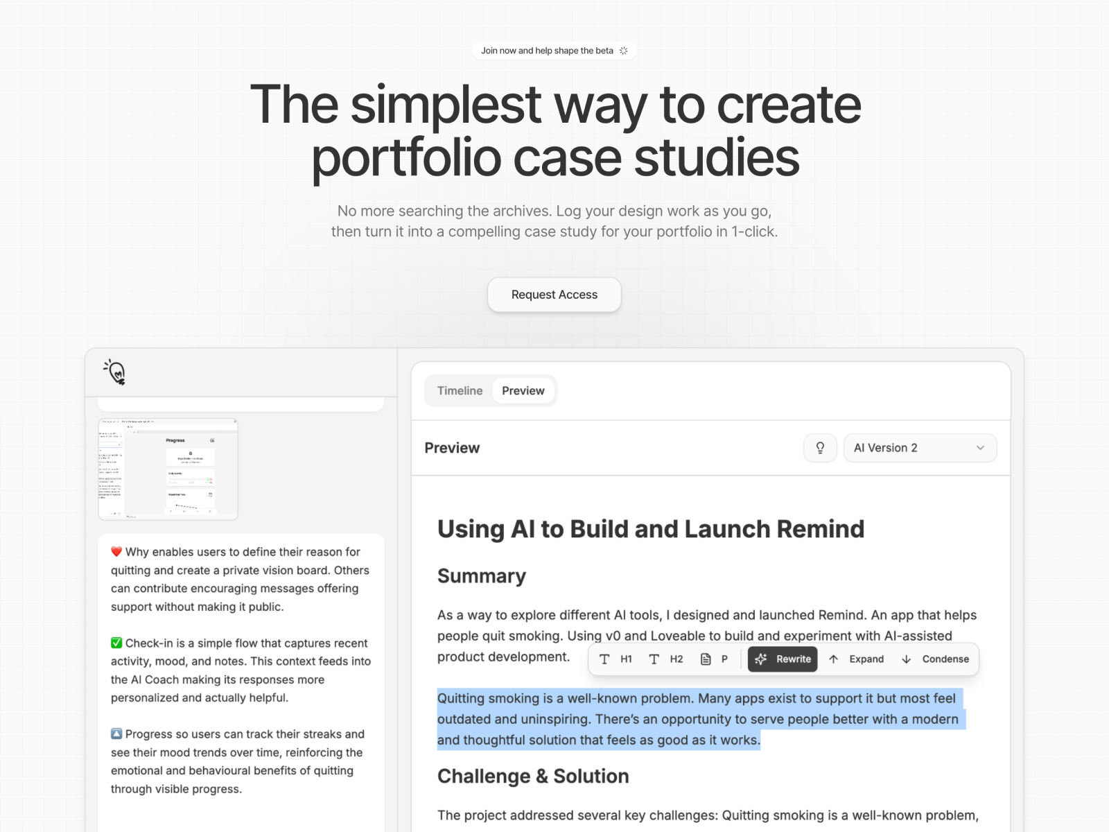 As a way to explore different AI tools and APIs, I designed and launched AI Design Portfolio. The simplest way to create portfolio case studies. Log your work as you go, then turn it into a compelling case study in 1-click.